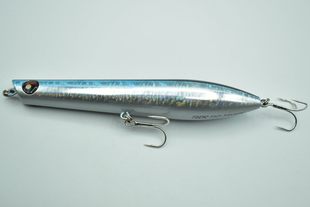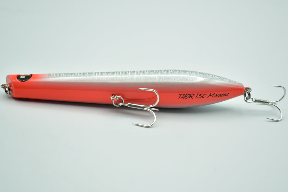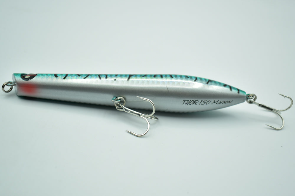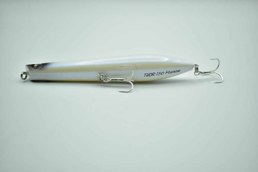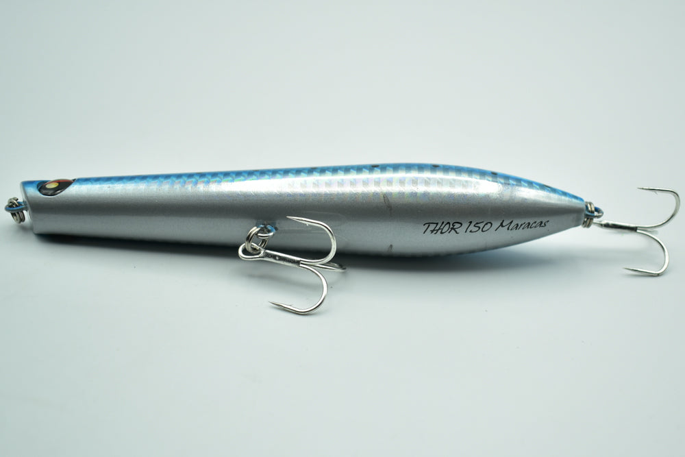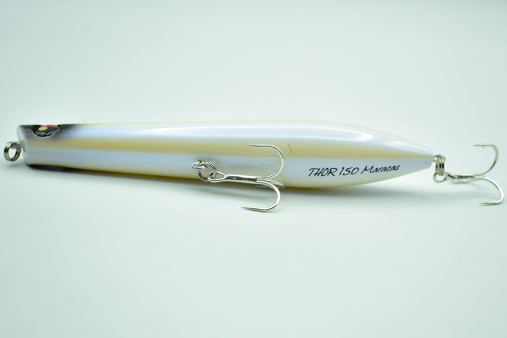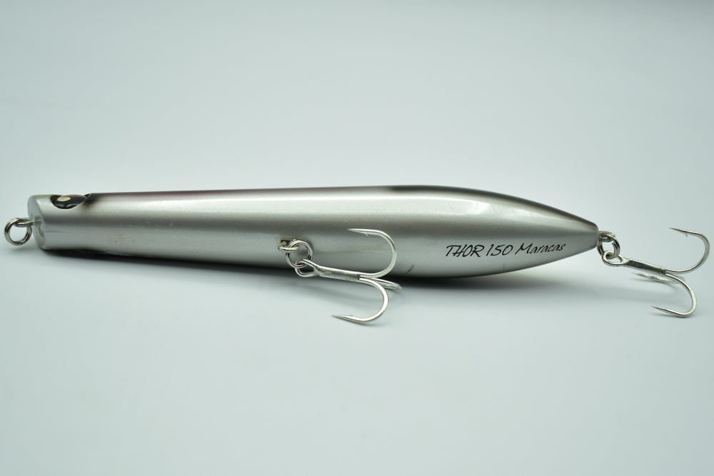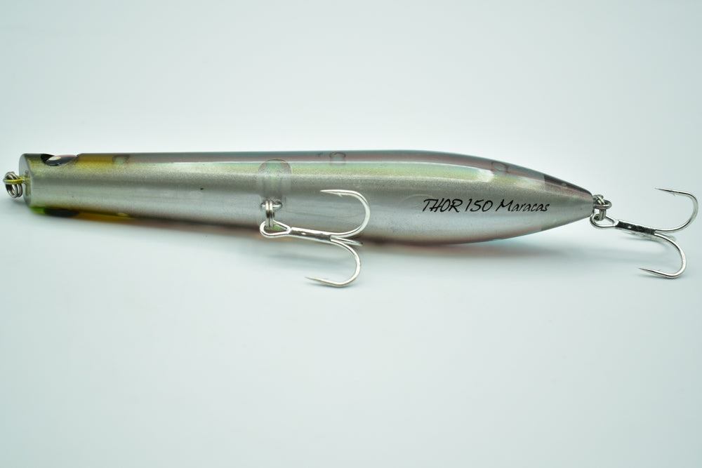 Le THOR 150 Maracas est un stickbait flottant conçu pour la pêche des carnassiers marins. Doté de billes à l’intérieur, il génère des vibrations et des sons qui attirent les poissons de loin.