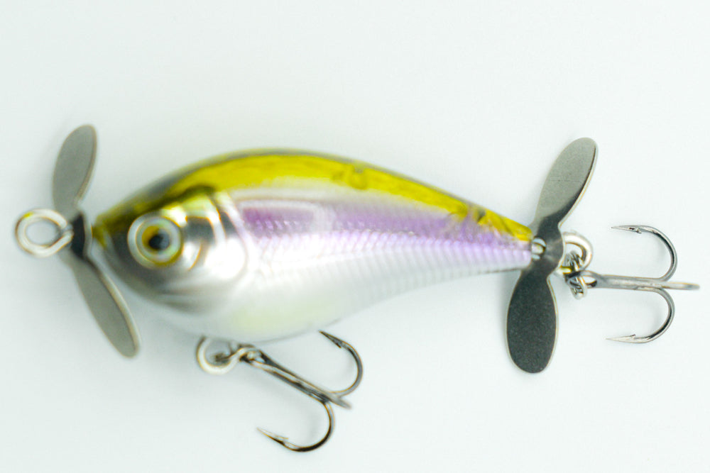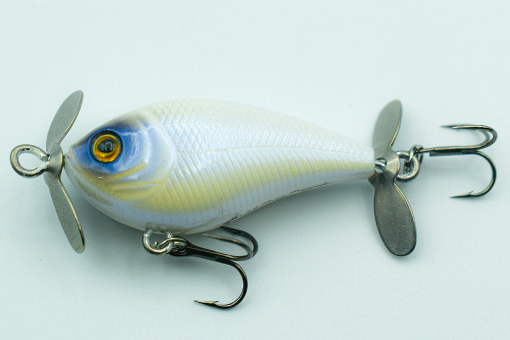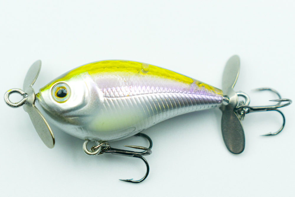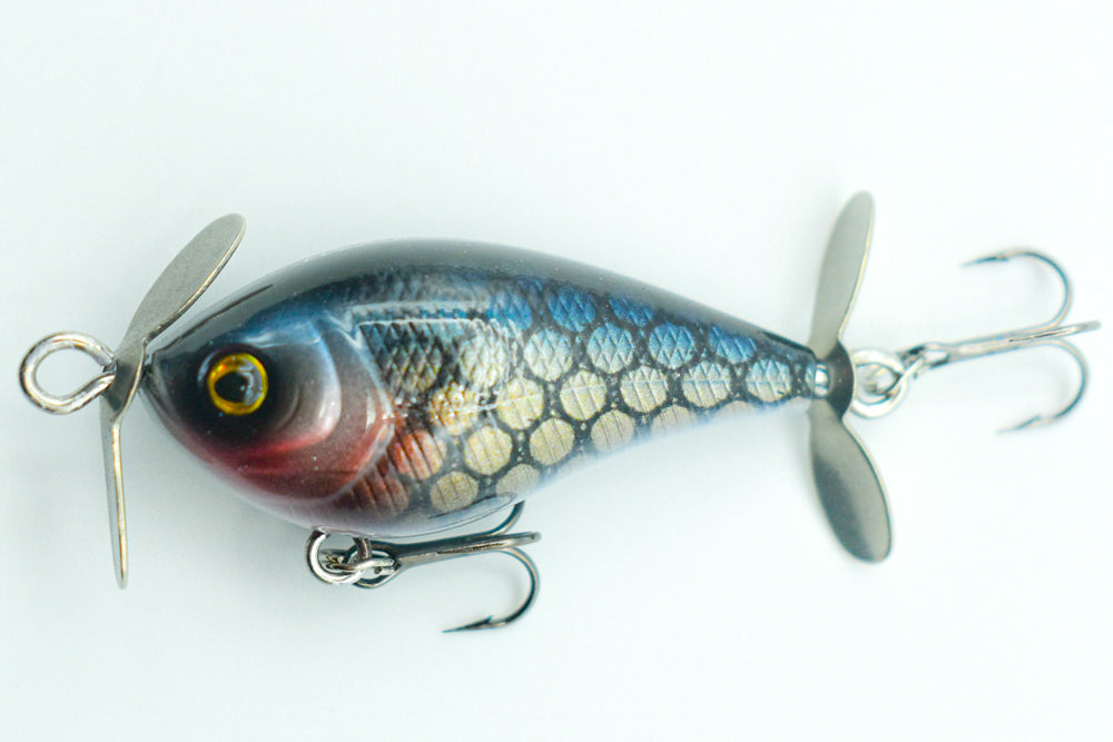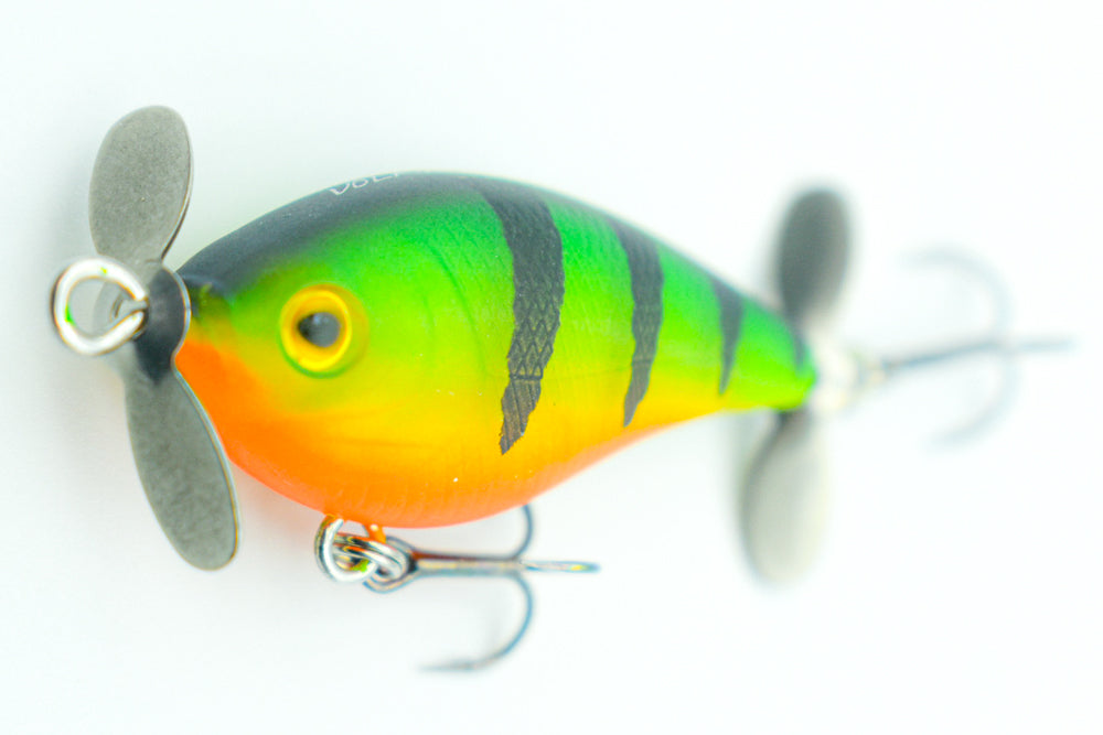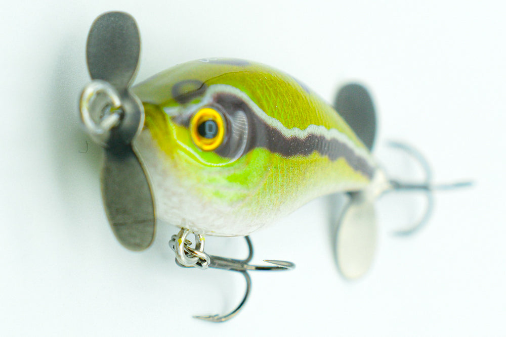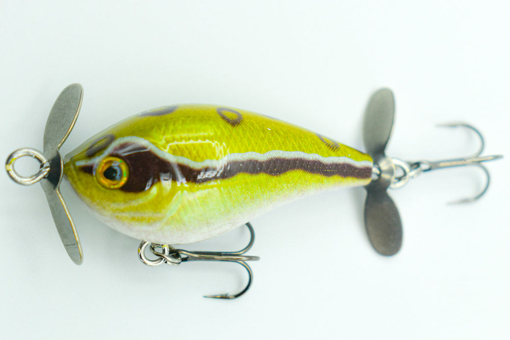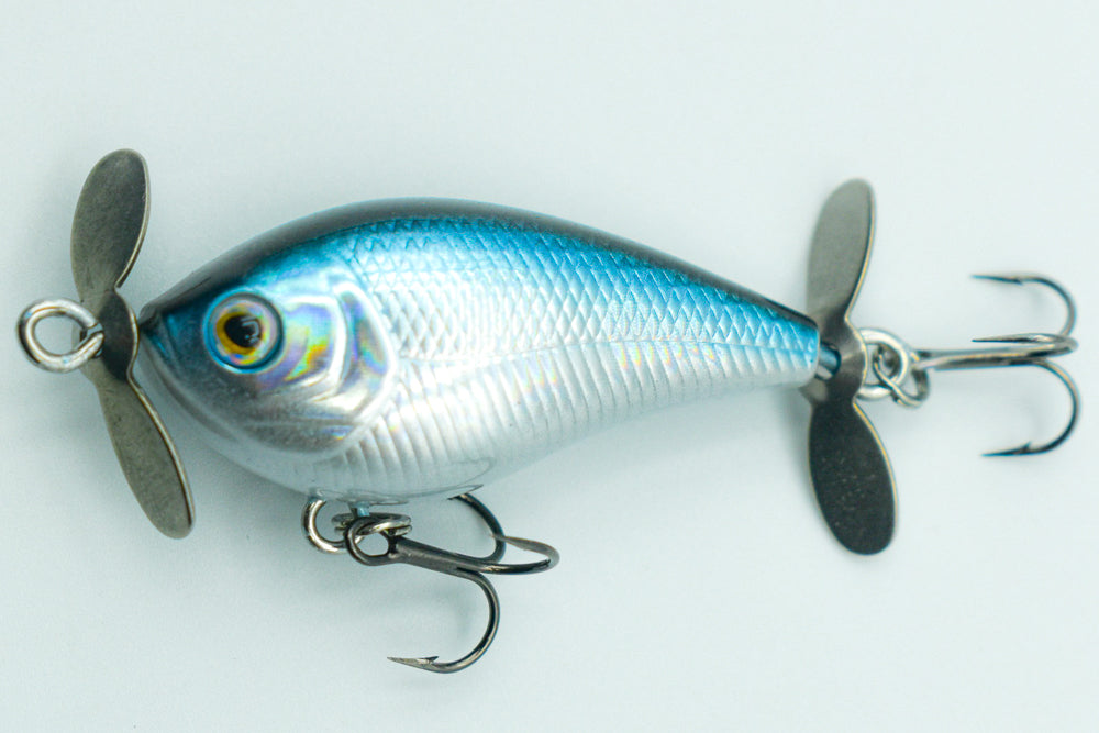 Son animation est polyvalente : en cranking régulier ou par tirées sèches, il se met immédiatement en action. Ses hélices brassent l’eau et projettent une gerbe éclaboussante qui attire les poissons de loin et déclenche des attaques fulgurantes.